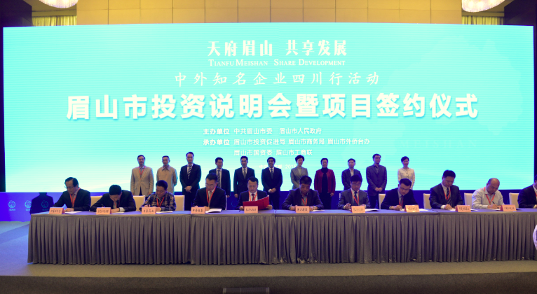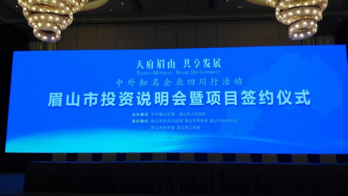 4月22日下午,肖董事长、时总参加了“中外知名企业四川行——眉山市投资说明会暨项目签约仪式”。此次会议的主题是:“天府眉山,共享发展”。会议由眉山市市长宋朝华主持,市委书记李静向来宾致辞。李书记表示,眉山是一个充满活力的城市,是众多企业的投资热点;投资眉山也一定能够给各企业的发展提供良好的回报。省人大副主任张东升参加了此次投资说明会并发表了讲话。