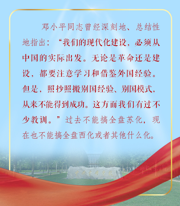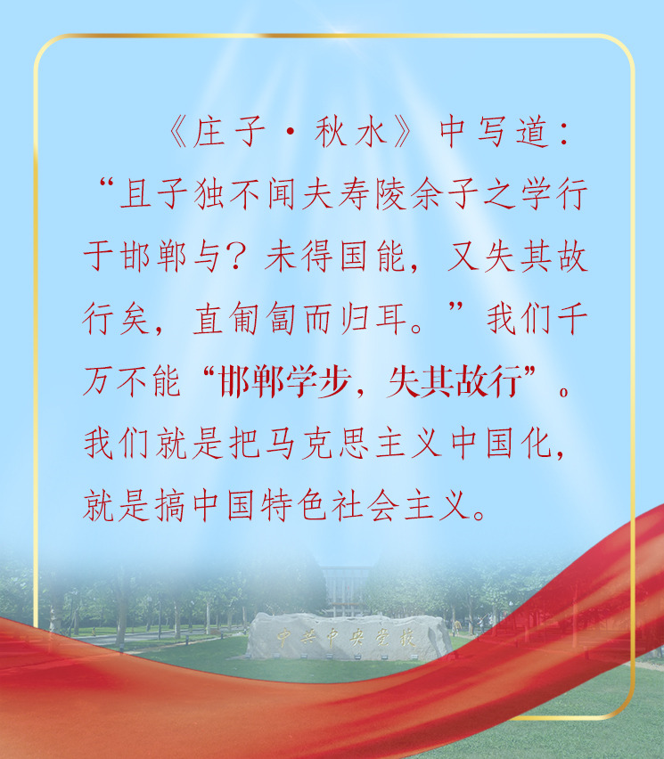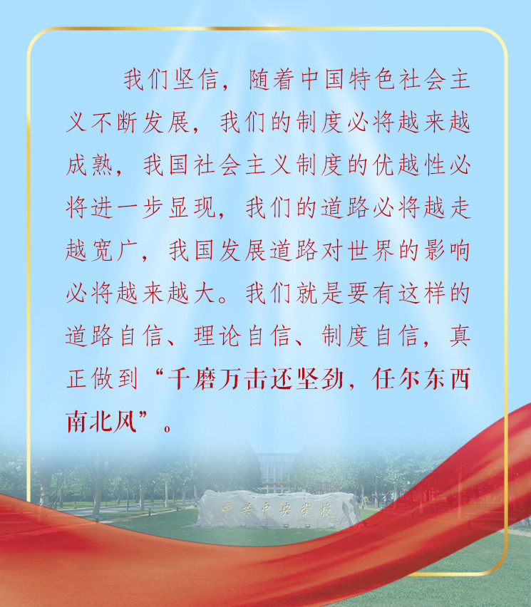 强调坚持和发展中国特色社会主义道路,习近平引用“风景这边独好”;学习和借鉴外国经验,习近平提醒千万不能“邯郸学步,失其故行”;坚持道路自信、理论自信、制度自信,习近平勉励我们真正做到“千磨万击还坚劲,任尔东西南北风”。妙语频出,发人深省。