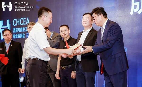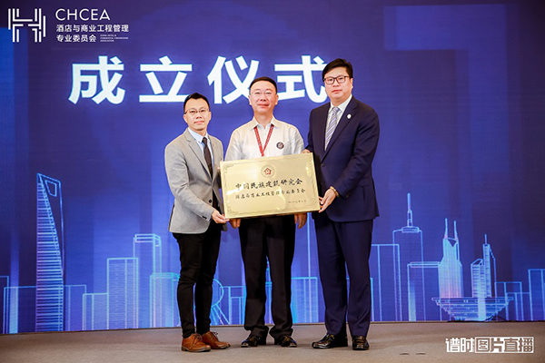 肖厚忠董事长向酒店与商业工程管理专业委员会主任唐鸣、秘书长郑添辉授牌